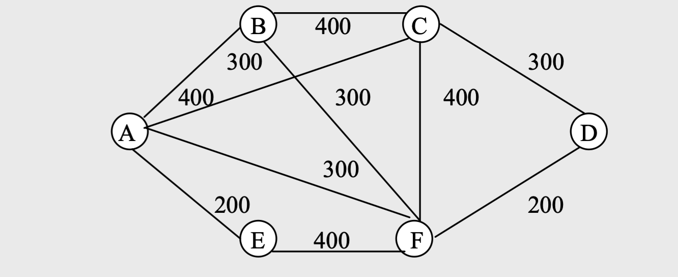 一次选取长度最小的边,题干图中6个节点则需要5条边(边数=节点数-1),因此有:AE、FD为200,AB、BF、AF、CD为400,最终方案有3种(如下图所示)。