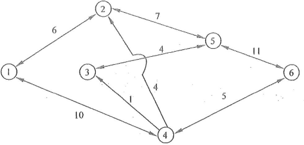 解题时,每找出一条路径算出流量后,该路径上各段线路上的流量应扣除已经算过的流量,形成剩余流量。剩余流量为0的线段应将其删除(断开)。例如,路径 12356的最大流量为10万吨,计算过后,该路径各段流量都减少10万吨,从而13之间断开,35之间剩余4万吨,56之间剩余11万吨,如图: