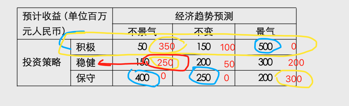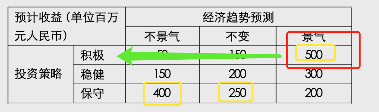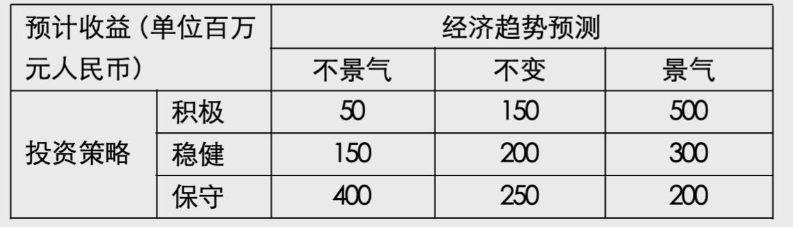 某公司需要根据下一年度宏观经济的增长趋势预测决定投资策略。宏观经济增长趋势有不景气、不变、景气3种,投资策略有积极、稳健和保守3种,各种状态收益如下表所示。应当怎么选择?