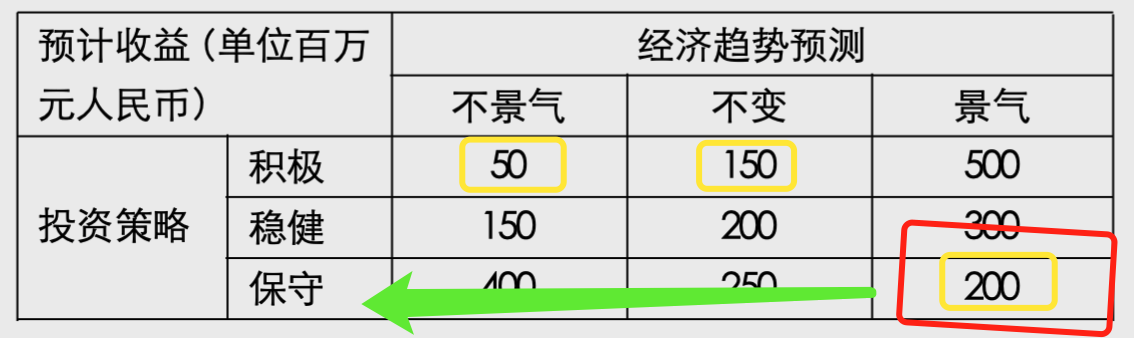 乐观主义准则,也称 “最大最大准则”,其决策原则是“大中取大”。决策者依次在决策表中的各个投资方案所对应的各个结果中选择出最大结果,并记录,最后再从这些结果中选出最大者,其所对应的方案就是应该采取的决策方案