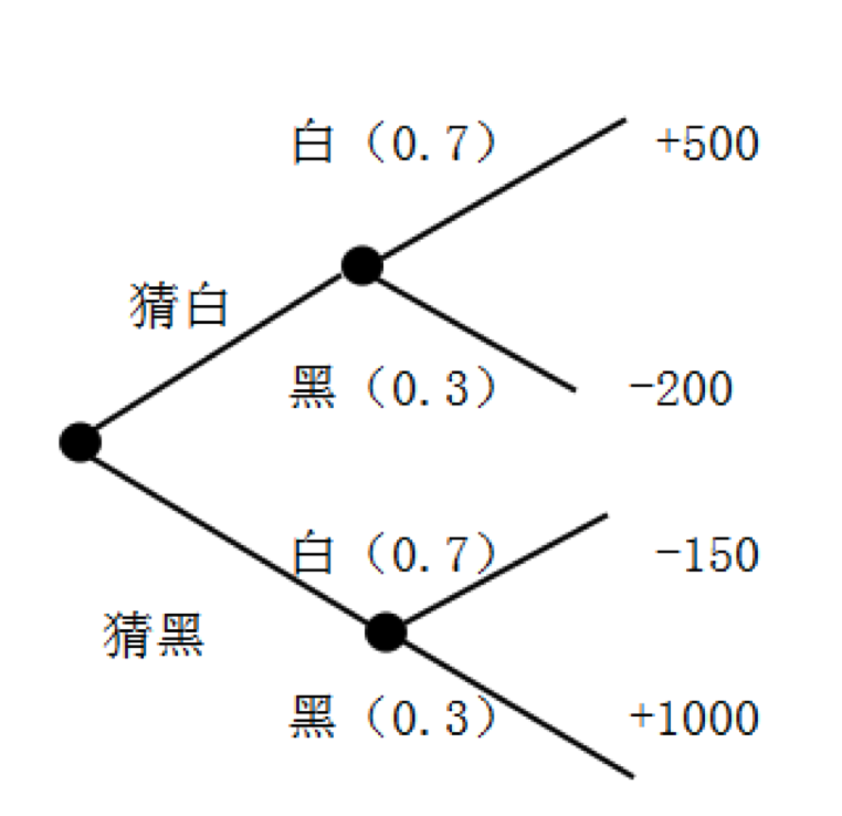 因此,”猜白“的方案是最优方案。假如白球的出现概率变成0.8,这时各方案的期望值变为:360,80;猜白仍为最优方案。