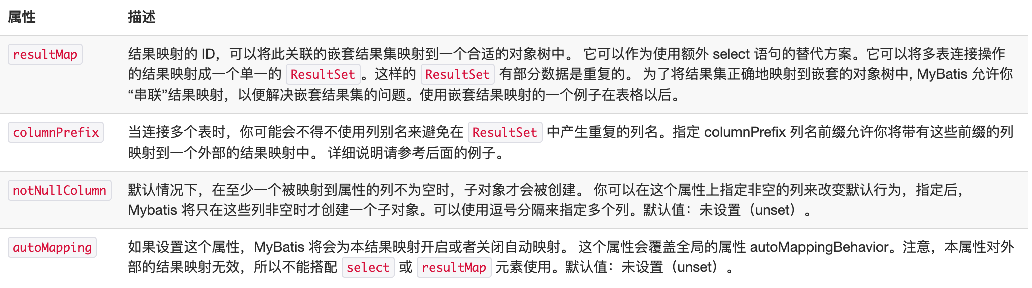 1 2 3 4 //其中ofType是集合泛型类型 <collection property="posts" column="id" ofType="Post" select="selectPostsForBlog"/> //-----或者---- <collection property="posts" javaType="ArrayList" column="id" ofType="Post" select="selectPostsForBlog"/>