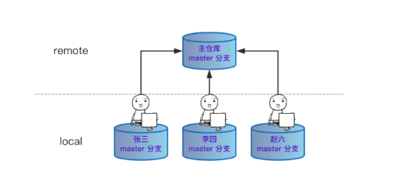 3人通过本地仓库 master 分支向远程仓库 master 分支提交代码