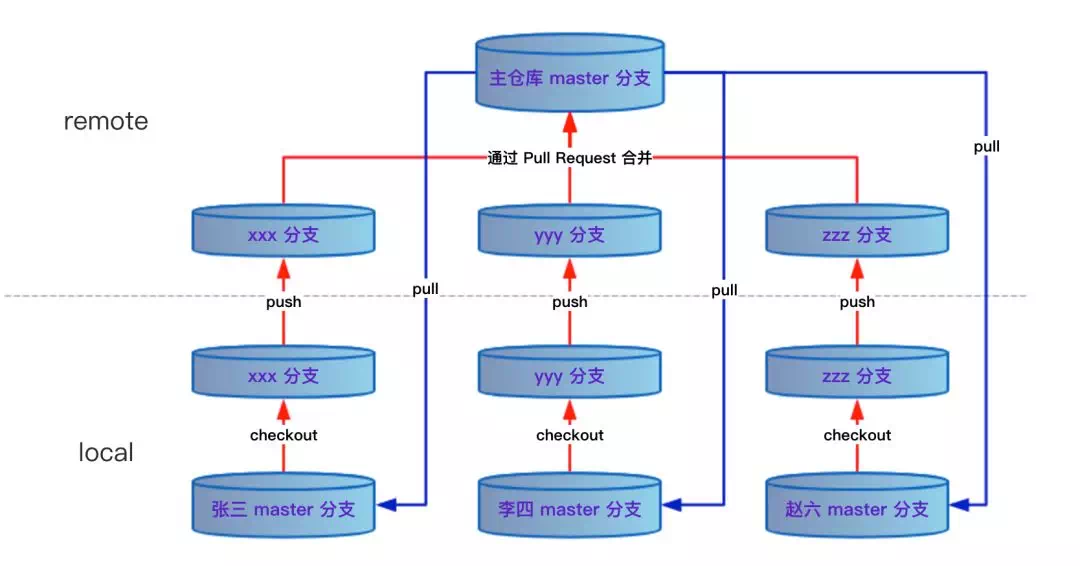本地 master 分支检出新分支开发推送到远端仓库后,通过 Pull Request 合并到 master,然后拉回本地 master。
