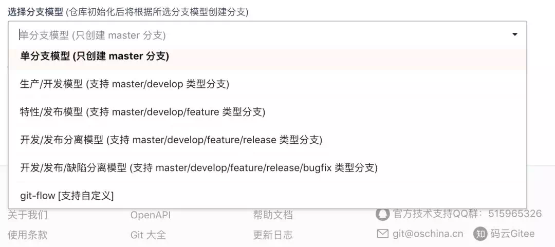 接下来的问题就比较简单了,在码云 gitee.com 上新建仓库,选择相应的分支模型即可。Git 的分支相比 SVN 来说是非常轻量级的,善用分支有利于更清晰的进行开发过程的管理。