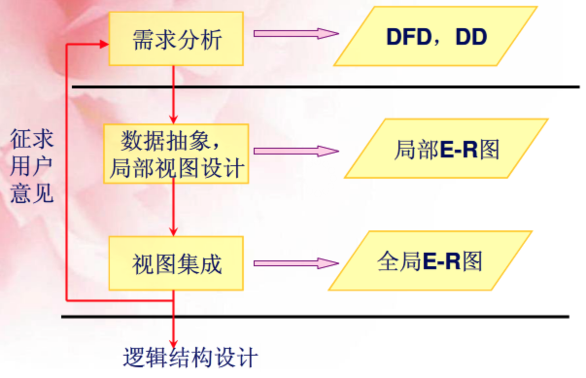 需求分析数据 --抽象–> 局部E-R模型 --集成–>全局E-R模型