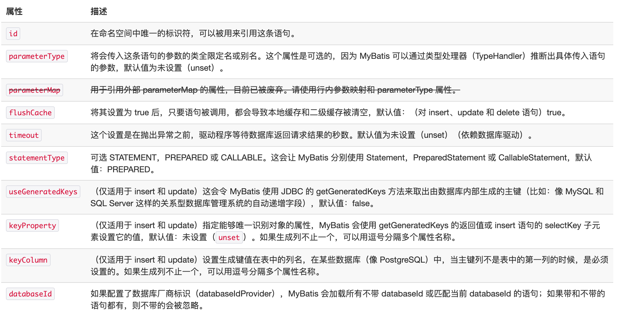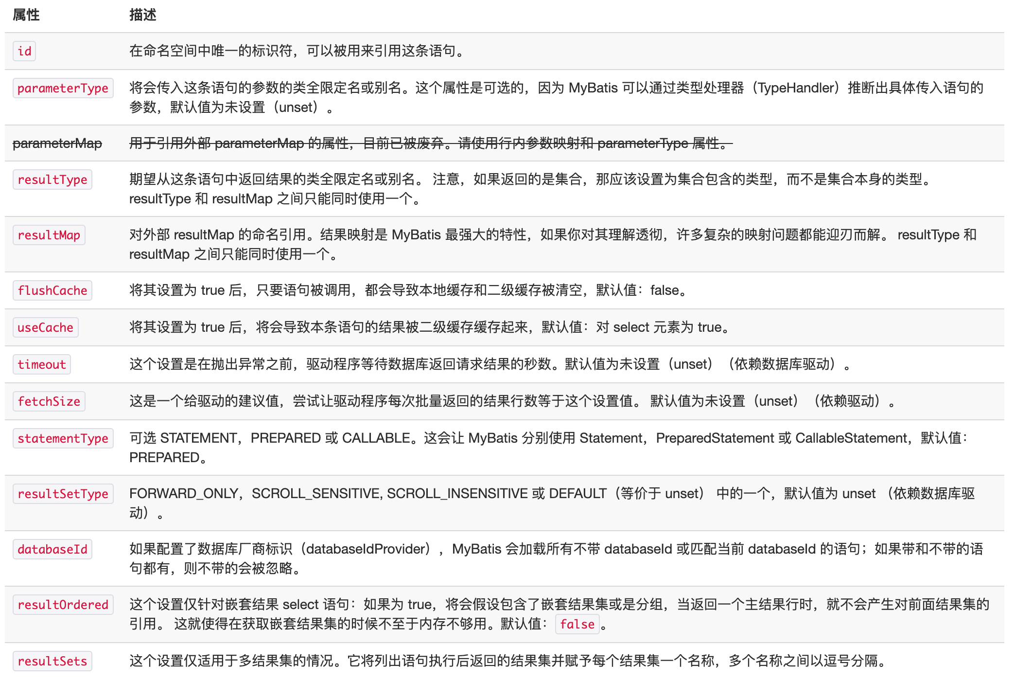 1 2 3 4 5 6 7 8 9 10 11 12 13 select id="selectPerson" parameterType="int" parameterMap="deprecated" resultType="hashmap" resultMap="personResultMap" flushCache="false" useCache="true" timeout="10" fetchSize="256" statementType="PREPARED" resultSetType="FORWARD_ONLY">