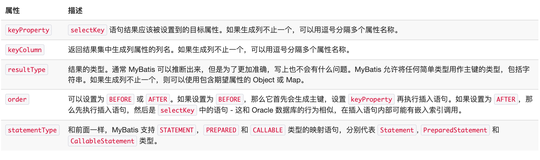 1 2 3 4 5 <selectKey keyProperty="id" resultType="int" order="BEFORE" statementType="PREPARED">