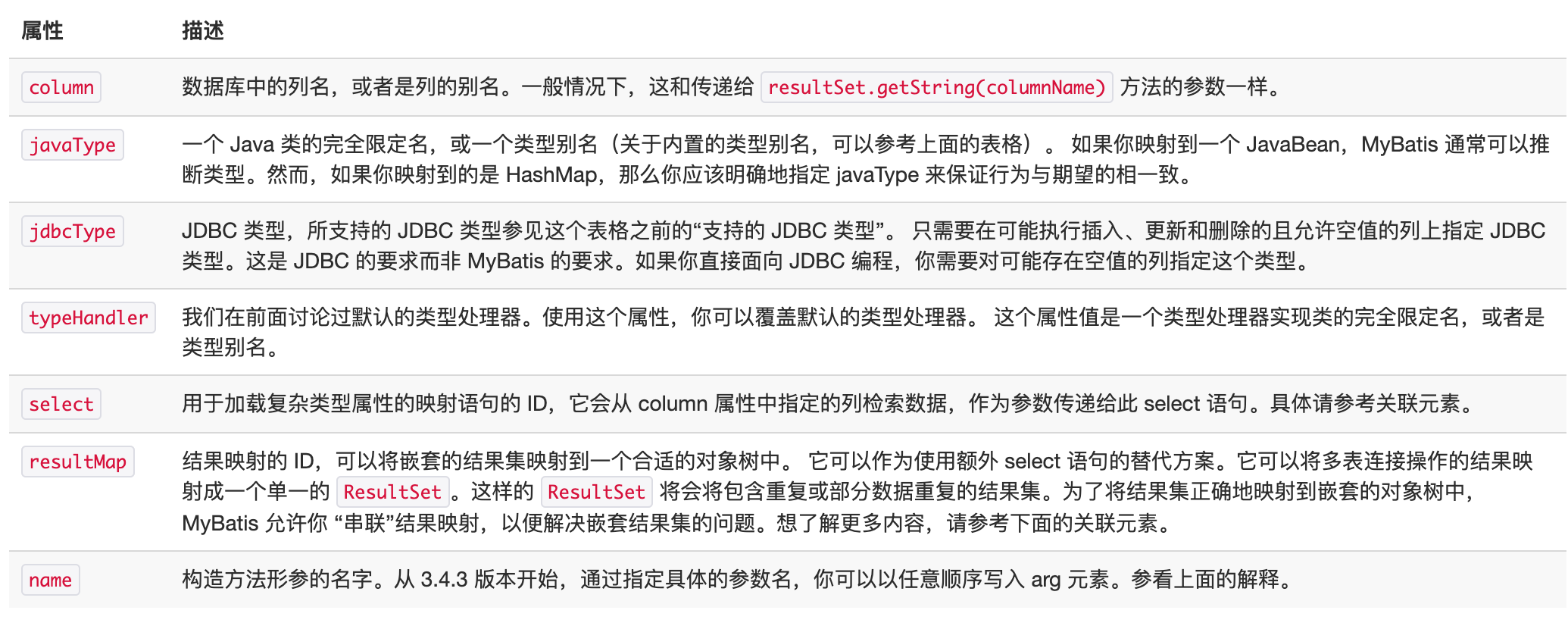 构造方法注入允许你在初始化时为类设置属性的值,而不用暴露出公有方法。MyBatis 也支持私有属性和私有 JavaBean 属性来完成注入,但有一些人更青睐于通过构造方法进行注入。 constructor 元素就是为此而生的。